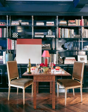 This is a serious pop of color, not only is the wall color a bold choice, but so is the contrasting color on the back of the bookcase. Somehow this works for me. I guess there are times where you have to go bold or go home.Image via the sadly extinct Domino.
